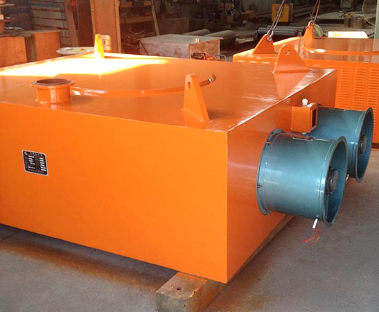 風(fēng)冷電磁除鐵器,采用空調(diào)或軸流風(fēng)機(jī)強(qiáng)迫風(fēng)冷,增加風(fēng)道,增大線路與空氣的接觸面積,改善風(fēng)冷效果。大型除鐵器采用軸流風(fēng)機(jī),風(fēng)壓高,風(fēng)量大,風(fēng)冷效果強(qiáng)??刂乒癫捎寐?lián)鎖機(jī)構(gòu),即風(fēng)機(jī)一停,除鐵器勵磁立即停電報(bào)警。